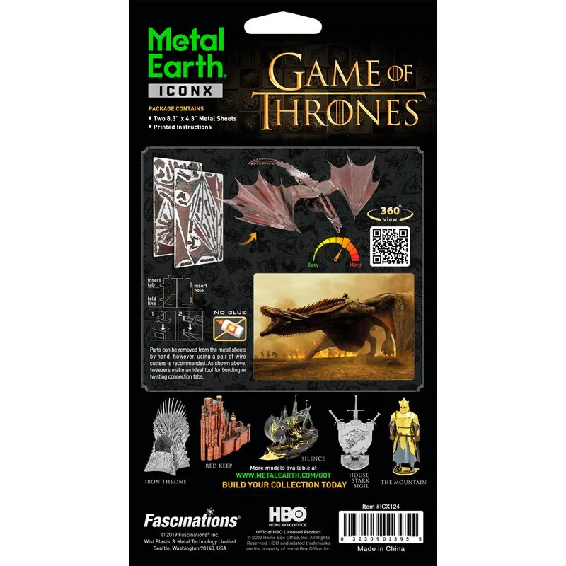 MetalEarth: ICONX – GAME OF THRONES / DROGON 21x19x4cm, maquette 3D en mĂ©tal avec 2 feuilles multicolorĂ©es, sur carte, 14+