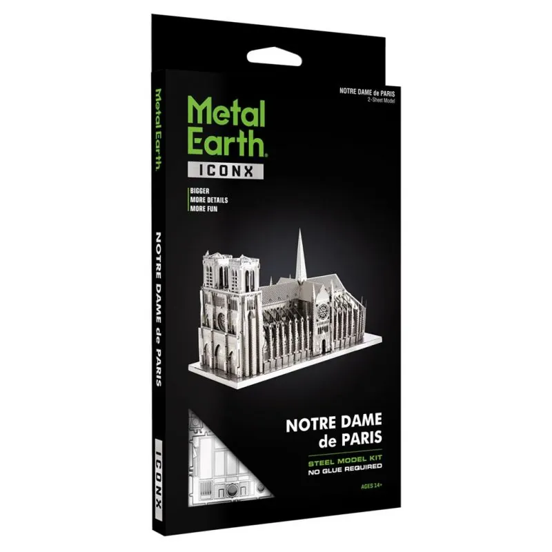 MetalEarth: ICONX – NOTRE DAME 8×11,7x5cm, maquette 3D en mĂ©tal avec 2 feuilles, en boĂ®te 13,5x22x2cm, 14+