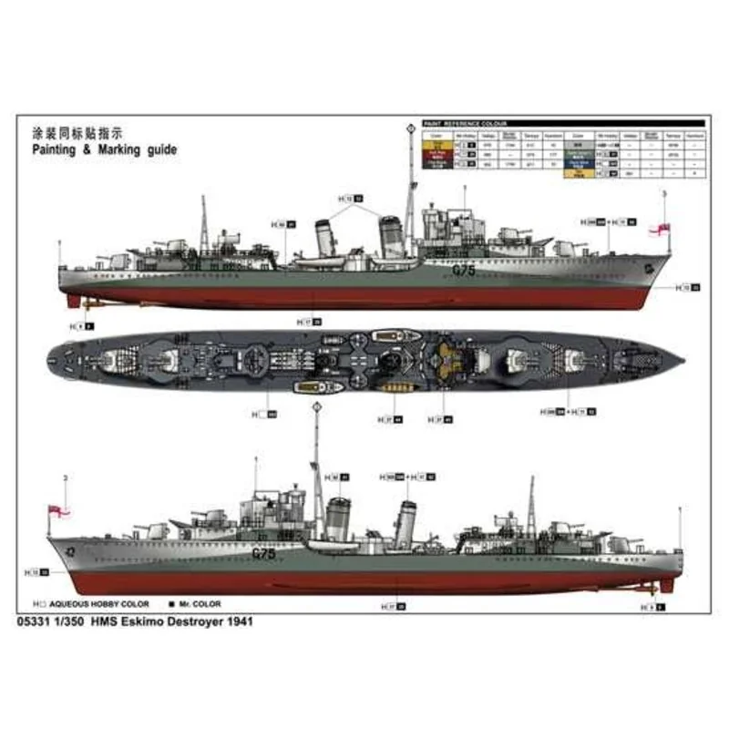 HMS Eskimo Destroyer 1941Echelle 1:350Maquette statiqueDimensions : Longueur : 328.3mm Largeur :15.8 mmNombre de pièces : 250+Pièces photo-dĂ©coupĂ©es : 1 plancheNombre de grappes : 7 grappes + coqueInfos complĂ©mentaires:Maquette Ă assembler composĂ©e de plus de 250 pièces,incluant des pièces photo-dĂ©coupĂ©esCoque moulĂ©e Ă l’aide d’un moule Ă tiroirsSupport inclus